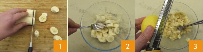 Para preparar o bolo de banana e iogurte, primeiro descasque as bananas e corte-as em rodelas 1, amasse-as com um garfo 2: você deve obter cerca de 100 g de polpa. Adicione a casca ralada do limão 3, misture e reserve.