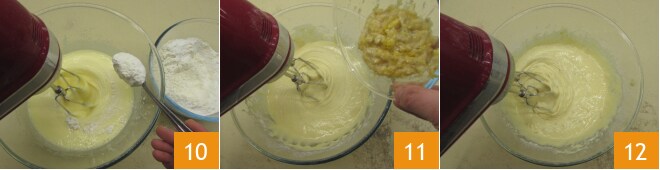 Adicione os ingredientes secos à mistura aos poucos, enquanto continua batendo 10. Quando os ingredientes secos estiverem bem incorporados, adicione as bananas amassadas 11 e misture até obter uma massa homogênea 12.