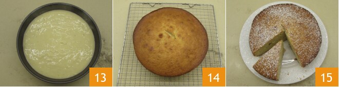 Despeje a massa em uma forma de 22 cm de diâmetro que você já untou previamente 13. Asse em forno estático pré-aquecido a 180° por cerca de 40 minutos. Após verificar o cozimento com um palito, retire o bolo do forno e deixe esfriar completamente em uma grade 14, depois polvilhe a gosto com açúcar de confeiteiro. Seu bolo de banana e iogurte está pronto para ser saboreado 15!