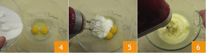 Ponha os ovos e o açúcar em uma tigela 4 e bata com a batedeira elétrica 5. Quando a mistura ficar clara e espumosa, adicione o óleo aos poucos 6.