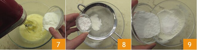 Junte também o iogurte 7 e continue batendo para incorporar tudo. Em outra tigela, peneire a farinha com o fermento e o sal 8, adicione a farinha de arroz 9 e misture.