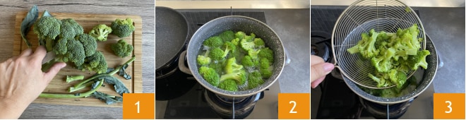 Para preparar o bolo de brócolis e linguiça, comece limpando os brócolis, removendo as folhas e destacando os floretes do caule 1, depois enxágue-os em água corrente e escalde-os em água salgada por cerca de 3 minutos 2. Em seguida, escorra-os e reserve 3.