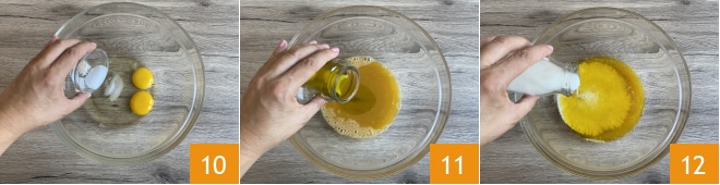 Em uma tigela, quebre os ovos, adicione o sal 10 e misture. Despeje o óleo 11 e o leite 12 e misture novamente.
