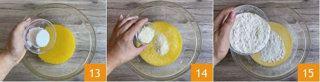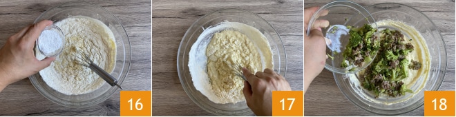 Adicione a ricota bem escorrida 13, depois adicione o queijo ralado 14, misture e incorpore a farinha em várias etapas 15.