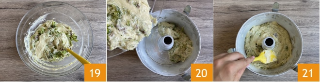 Incorpore-os delicadamente à massa 19 e despeje-a em uma forma de bolo de 18 cm untada e enfarinhada 20. Nivele a superfície com uma espátula 21.
