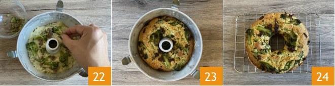 Adicione o recheio restante por cima 22, asse a 180°, em forno estático pré-aquecido, por cerca de 35/40 minutos. Retire do forno 23 e transfira para uma grelha para esfriar, depois sirva o bolo de brócolis e linguiça.