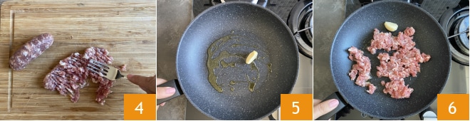 Retire a pele das linguiças e amasse-as com um garfo 4, depois coloque em uma frigideira um fio de óleo e um dente de alho 5, adicione a linguiça e cozinhe por cerca de 3 minutos 6.