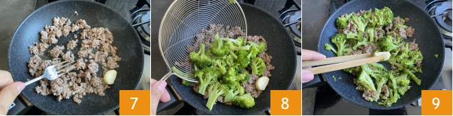 Quando a linguiça estiver bem dourada 7, adicione os brócolis 8, despeje-os na frigideira com a linguiça, deixe-os pegar sabor por 5 minutos, retire o dente de alho 9, tire do fogo e deixe esfriar.
