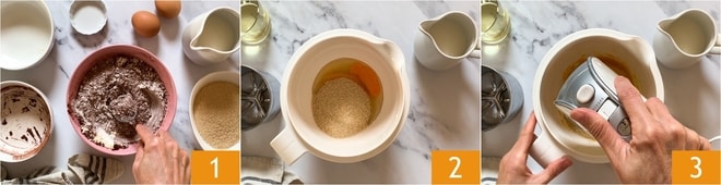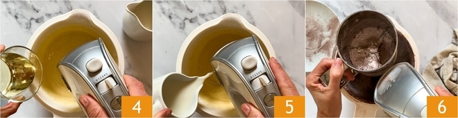 Sempre com a batedeira em ação, adicione aos poucos o óleo 4 e, quando estiver bem incorporado, o leite 5. Agora reduza a velocidade da batedeira e adicione as partes secas peneirando-as diretamente na tigela 6.