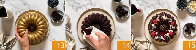 Uma vez frio, desenforme o bolo em um prato 13, despeje a calda de frutas vermelhas por cima 14 e decore com lascas de amêndoas e frutas vermelhas 15.