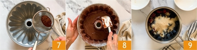 Uma vez que a massa estiver pronta, pegue uma forma de buraco no meio grande de 22-24 cm, unte-a e polvilhe com cacau 7. Transfira a massa para dentro e nivele com uma espátula. Asse em forno estático pré-aquecido a 160°C por 45 minutos. Sempre faça o teste do palito antes de tirar o bolo do forno, então deixe esfriar. Neste ponto, prepare a calda. Em uma panela, coloque as frutas vermelhas, a água e o açúcar mascavo 9.