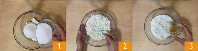 Para preparar o bolo de cacau sem manteiga, comece pela massa. Coloque a ricota e o açúcar em uma tigela 1. Trabalhe bem com um garfo até misturar os ingredientes. Agora adicione o rum 3.