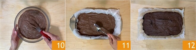 Usando um batedor manual, misture bem a massa, que deve resultar densa, homogênea e sem grumos 10. Pegue uma assadeira de 20x30 cm, forre com papel manteiga e despeje a massa dentro. Nivele a superfície com as costas de uma colher e asse em forno ventilado pré-aquecido a 170° por 45 minutos, na prateleira central. Retire o doce do forno e deixe esfriar. Agora, levantando delicadamente o papel manteiga, transfira o bolo para uma superfície de trabalho 12.
