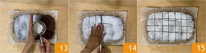 Polvilhe com açúcar de confeiteiro 13 e corte o bolo em 28 cubos, fazendo 7 tiras verticais e 4 horizontais 14. O bolo de cacau sem manteiga está pronto para ser servido 15.