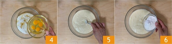 Adicione também os 4 ovos previamente quebrados 4 e continue trabalhando com o garfo até obter um creme uniforme 5. Agora adicione os ingredientes secos: comece pela farinha 6.