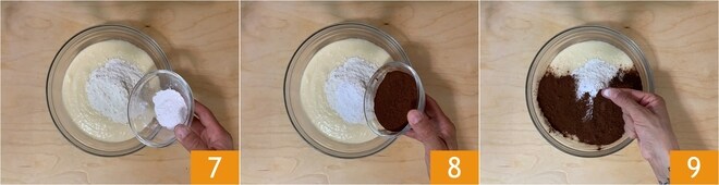 Adicione também o fermento 7, o cacau 8 e uma pitada de sal 9.