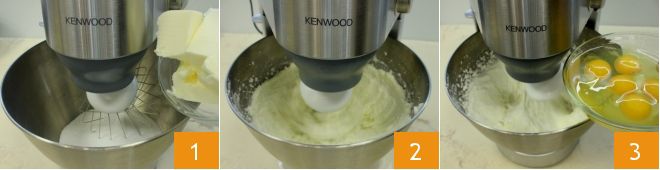 Quando tiver misturado bem todos os ovos e obtido uma mistura lisa e homogênea, reduza a velocidade dos batedores e comece a peneirar a farinha 4 e o fermento 5, recolhendo-os juntos em uma tigela pequena. Então, reposicione os batedores na velocidade inicial e adicione as farinhas peneiradas aos poucos, ajudando-se com uma colher 6, depois acrescente o extrato de baunilha ou as sementes de uma fava.