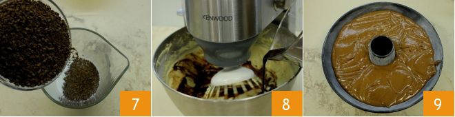 Uma vez que tiver incorporado e misturado bem os ingredientes, você pode passar a dissolver o café solúvel no leite à temperatura ambiente ou ligeiramente aquecido 7. Misture com uma colher até que o café esteja completamente dissolvido, depois adicione-o lentamente ao restante da mistura na batedeira 8. Misture tudo continuando a bater até obter uma mistura densa e homogênea. Em seguida, unte e enfarinhe uma forma de bolo com 22 cm de diâmetro e 10 cm de profundidade e despeje a mistura dentro dela 9, nivelando-a com a ajuda de uma espátula. Coloque o bolo para assar em forno estático pré-aquecido a 180°C por 50 minutos (se for forno ventilado, 160°C por 40-45 minutos).