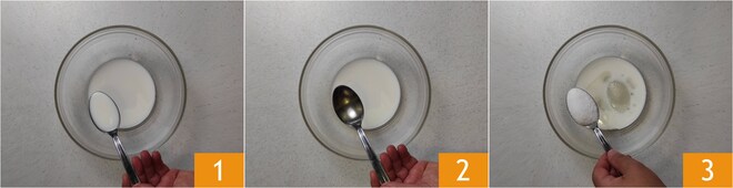 Para preparar o bolo na caneca sem ovos, em uma tigela, coloque o leite 1, o óleo 2 e o açúcar 3.
