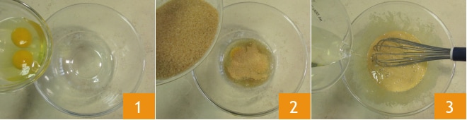 Para preparar o bolo de chocolate sem manteiga, primeiro derreta o chocolate em banho-maria ou no micro-ondas e deixe esfriar. Coloque os ovos em uma tigela 1, adicione o açúcar mascavo 2 e misture com um batedor de mão, depois adicione o óleo de sementes 3.