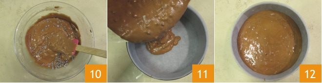Mexa com uma espátula para incorporar as gotas de chocolate de maneira uniforme 10. Despeje a massa em uma forma de 22 cm de diâmetro forrada com papel manteiga 11 e asse em forno estático pré-aquecido a 180°C por cerca de 40 minutos, na grade do meio 12.