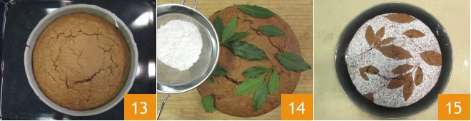 Depois de assado, retire o bolo do forno e deixe esfriar completamente antes de desenformar 13. Para a decoração, você pode usar folhas, como de louro, que você lavou e secou previamente, e polvilhar a superfície com açúcar de confeiteiro 14. Seu bolo de chocolate sem manteiga está pronto para ser servido 15!
