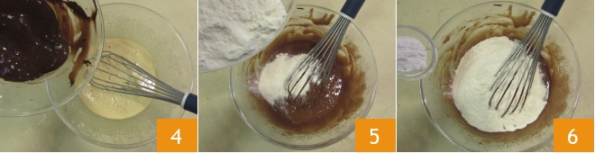 Adicione também o chocolate derretido e já morno 4 e misture com o batedor por um minuto, depois adicione a farinha 5 e o fermento 6.