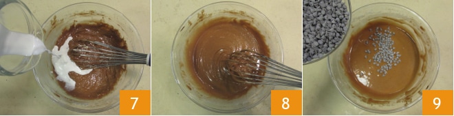 Por fim, adicione o leite de amêndoas 7 e continue a misturar para incorporar tudo. Quando você tiver uma massa lisa e homogênea 8, adicione as gotas de chocolate 9.