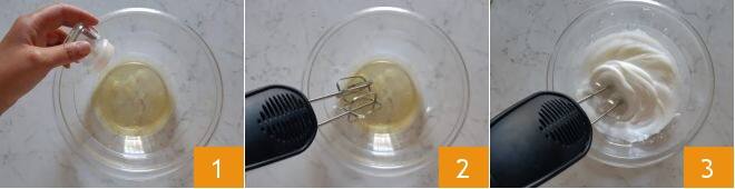 Para preparar o bolo de claras e cacau, primeiro coloque as claras em uma tigela grande. Adicione uma pitada de sal 1 e comece a bater com a batedeira elétrica 2 até que as claras fiquem em neve firme 3.