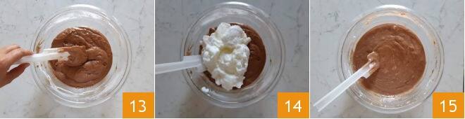 até obter uma massa lisa e homogênea 13. Incorpore então as claras aos poucos 14, mexendo de baixo para cima. Quando tiver terminado 15