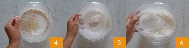 Em outra tigela, peneire a farinha 4 e o fermento 5. Em seguida, adicione o açúcar 6