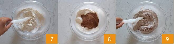 e misture os ingredientes secos 7. Depois, adicione o cacau 8 e misture novamente 9.