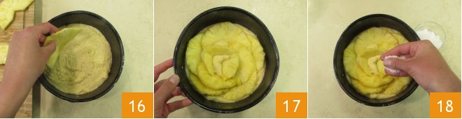 Agora pegue 100 g de fatias de abacaxi e, começando pela parte mais externa 16, distribua-as em espiral para criar um padrão floral 17. Decore a superfície com o coco ralado (18-19).