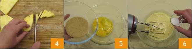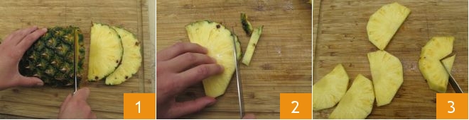 Para preparar o bolo de coco e abacaxi, primeiro corte o abacaxi em fatias de meio centímetro de espessura 1, depois retire a parte externa de cada fatia 2 e o miolo central 3.