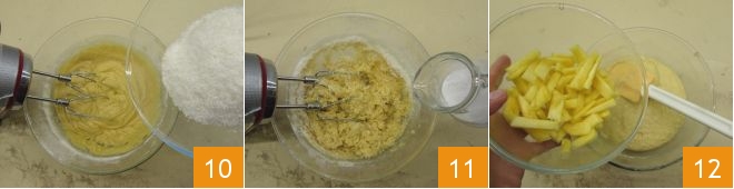 Dê uma batida para incorporar os ingredientes secos e depois adicione o coco ralado 10 e o leite de coco em fio 11, ligue novamente a batedeira para incorporá-lo. Uma vez que o líquido for absorvido, adicione as fatias de abacaxi 12