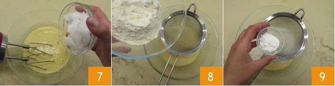 Adicione também o óleo de coco 7, incorpore-o à mistura com a batedeira e depois acrescente a farinha 8, o fermento em pó 9