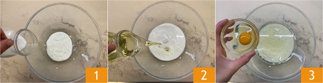 Para preparar o bolo de coco recheado, como primeiro passo em uma tigela, adicione o iogurte de coco, o leite 1, o óleo de sementes 2 e o ovo 3.