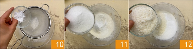 Peneire também o bicarbonato 10, depois adicione o açúcar 11 e o coco ralado 12.