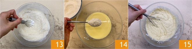 Mexa bem 13, depois incorpore os ingredientes secos aos líquidos 14. Misture tudo com um batedor manual até obter uma massa lisa e homogênea 15.
