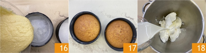 Unte duas formas de 20 cm de diâmetro com manteiga, coloque um disco de papel manteiga no fundo e polvilhe as bordas com farinha. Divida a massa igualmente entre as formas 16. Coloque ambas as formas na prateleira inferior do forno e asse em forno estático pré-aquecido a 175°C por 35 minutos 17. Durante os últimos minutos, verifique o cozimento fazendo o teste do palito. Esta receita não requer calda, então é importante que os bolos não assem além do ponto para manter uma massa suficientemente úmida. Uma vez assados, retire do forno e deixe esfriar completamente. Enquanto isso, prepare o frosting: em uma batedeira, coloque o mascarpone e o queijo fresco cremoso, depois adicione o creme de leite fresco 18.