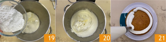 Adicione o açúcar de confeiteiro 19 e bata com o batedor até obter um creme bastante compacto 20. Você pode seguir o mesmo procedimento usando uma tigela e uma batedeira elétrica. Transfira o creme para um saco de confeitar com bico liso de 10-12 mm de diâmetro. Uma vez que os bolos estejam frios, desenforme-os e, se necessário, corte o topo para nivelar antes de colocá-los em um prato de servir. Adicione sobre a superfície uma camada de creme com cerca de 1,5-2 cm de espessura 21.