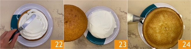Nivele o creme 22, depois coloque o segundo bolo por cima com o topo voltado para baixo 23. Distribua o frosting nas bordas criando tiras verticais 24.