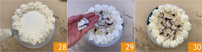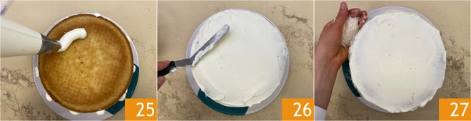 Adicione o creme também na superfície 25, depois com a ajuda de uma espátula espalhe uniformemente para cobrir todo o bolo 26. Neste ponto, adicione o coco ralado nas bordas do bolo 27.