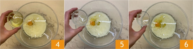 Adicione a clara de ovo 4, o suco de limão 5 e o vinagre de vinho branco 6.