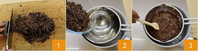 Para preparar o bolo de iogurte e chocolate, comece pelo último: pique o chocolate meio amargo e derreta em banho-maria 2: é importante que a água da panela no fogo não atinja o fundo da tigela ou do recipiente onde o chocolate está. Mexa de vez em quando com uma colher de pau para ajudar a derreter o chocolate 2. Quando estiver pronto, desligue e deixe esfriar.