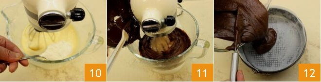 e, quando o óleo estiver completamente absorvido, adicione os ingredientes secos, uma colher de cada vez 10. Quando a farinha estiver completamente incorporada, você pode adicionar o chocolate derretido já frio 11 e bater a massa por mais alguns minutos para obter uma mistura homogênea e fluida. Unte e forre uma forma com papel manteiga de 24 cm de diâmetro. Despeje a massa dentro 12