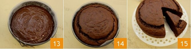 e nivele com uma espátula sem bater a forma para não inibir a ação do fermento. Asse o bolo 13 em forno estático pré-aquecido a 170°C por 45-50 minutos (150°C em forno ventilado por 35-40 minutos). Uma vez assado, retire do forno 14 e deixe amornar, depois coloque o bolo de iogurte e chocolate em uma grade para esfriar completamente. Quando estiver frio, você pode polvilhar com açúcar de confeiteiro e servir 15!