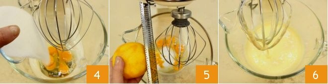 Enquanto isso, na tigela de uma batedeira equipada com batedor, coloque os ovos e adicione o açúcar 4, rale a casca de 1 laranja não tratada 5 e comece a bater a mistura: deve ficar branca e espumosa 6.