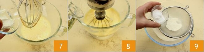 Nesse ponto, adicione o iogurte aos poucos 7 e, quando estiver bem misturado, adicione o óleo de sementes em fio 8. Depois, em uma tigela, peneire a farinha com o fermento 9