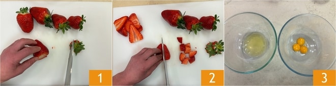Para preparar o bolo de iogurte com morangos e amêndoas, primeiro lave delicadamente os morangos e retire os cabinhos 1. Corte metade em fatias (as mais bonitas) e a outra metade em cubos 2. Em seguida, separe as claras das gemas dos ovos em 2 tigelas 3.